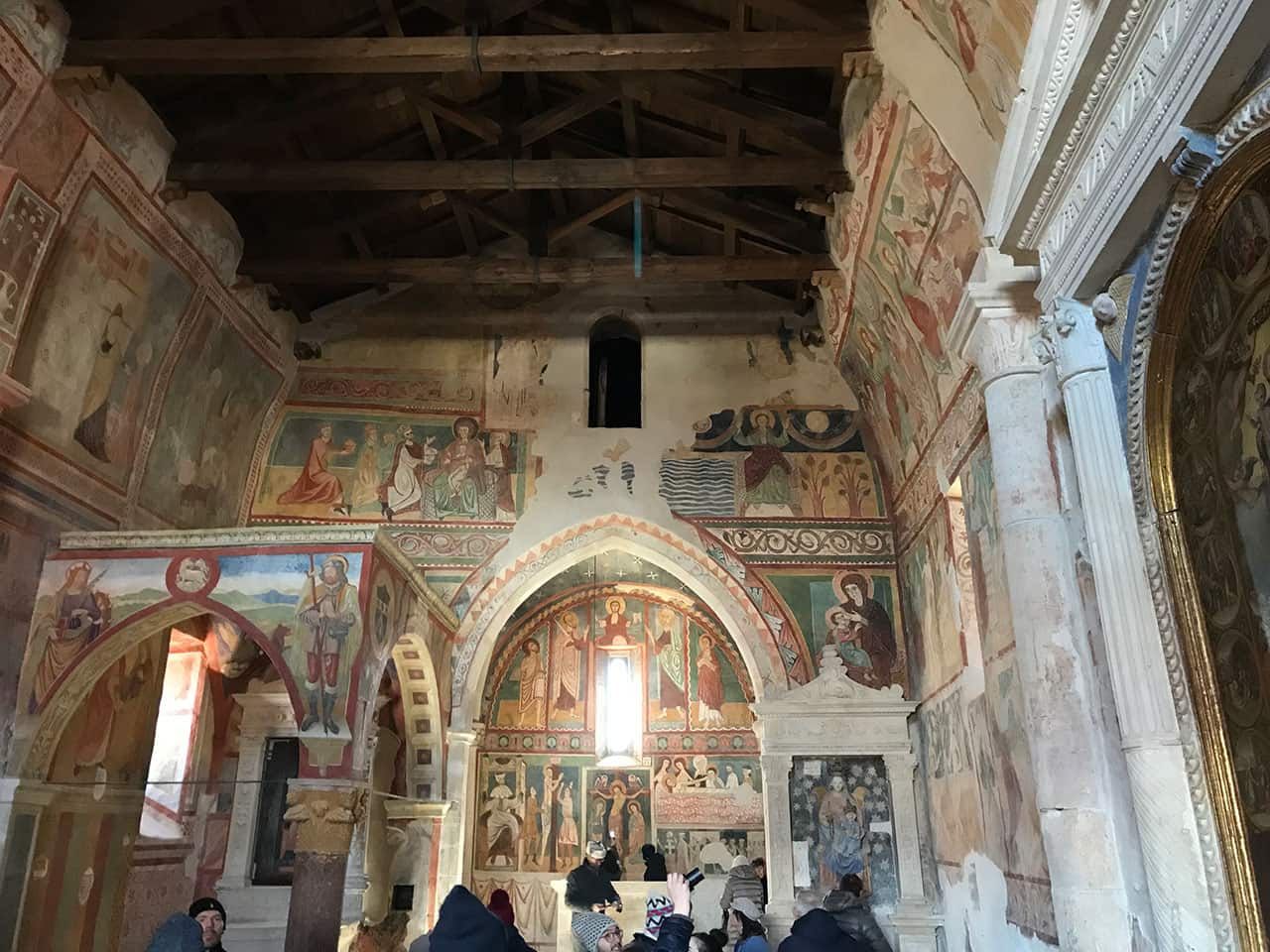 Insieme al “canone” rappresentato dall’Oratorio di San Pellegrino di Bominaco, sempre nell’area aquilana, Santa Maria ad Cryptas è uno scrigno tanto scabro all’esterno quanto prezioso una volta varcata la soglia di ingresso, che apre su un ciclo di affreschi tra i più importanti in Abruzzo. Le scene sacre si avvicendano secondo due stili ed epoche distinte: il primo, di matrice bizantina, l’altro, successivo, di impronta toscana.