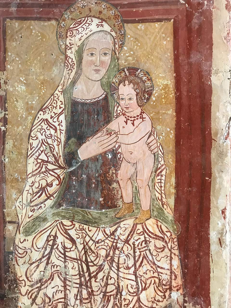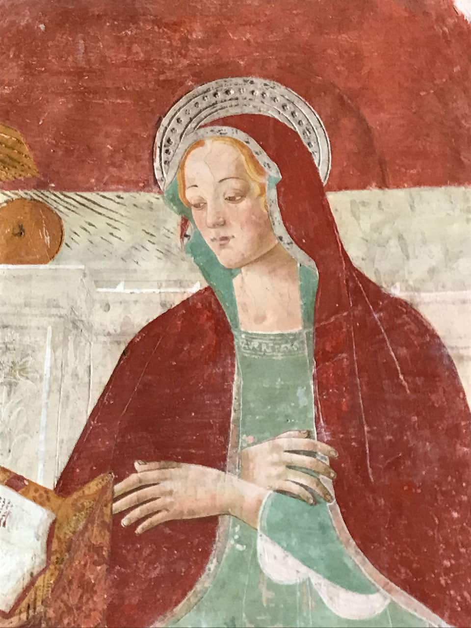 A fianco dell’altare, troneggia la Madonna del Latte di Gentile da Rocca (1283), splendidamente oscura, medioevale e opposta alla quattrocentesca scena dell’Annunciazione della parete settentrionale, realizzata pare da Sebastiano di Nicola da Casentino che così sotto il dipinto scrive, come per chiarirci una volta per tutte la committenza ricevuta: “Quisti Santi Ella Chappella a (fatta) pegnere Antonio De Paulu de Fossa – Sebastiano Pisis 1486”. Accanto ancora una figura della Madonna che tiene in grembo il bambino con una collana di coralli e, curioso dettaglio, con indosso delle scarpette.