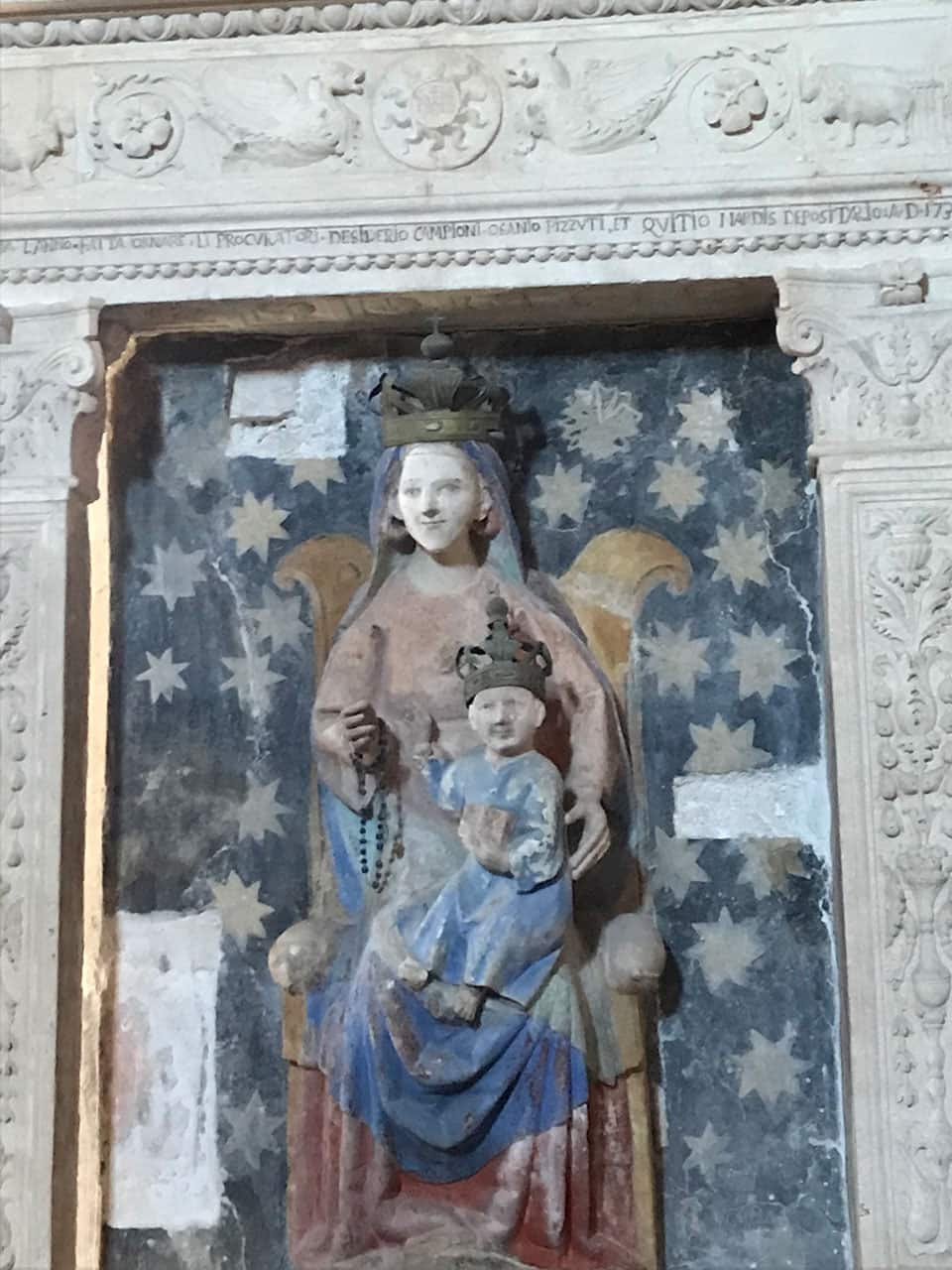 Si vedono scene dalla vita della Vergine, la sua natività (in parte coperta da una loggia cinquecentesca successivamente aggiunta) e la visita alla cugina Elisabetta che indossa il manto giallo come indica l’iconografia ricorrente dell’episodio (da Giotto al Ghirlandaio, sino al Barocci della Chiesa Nuova).