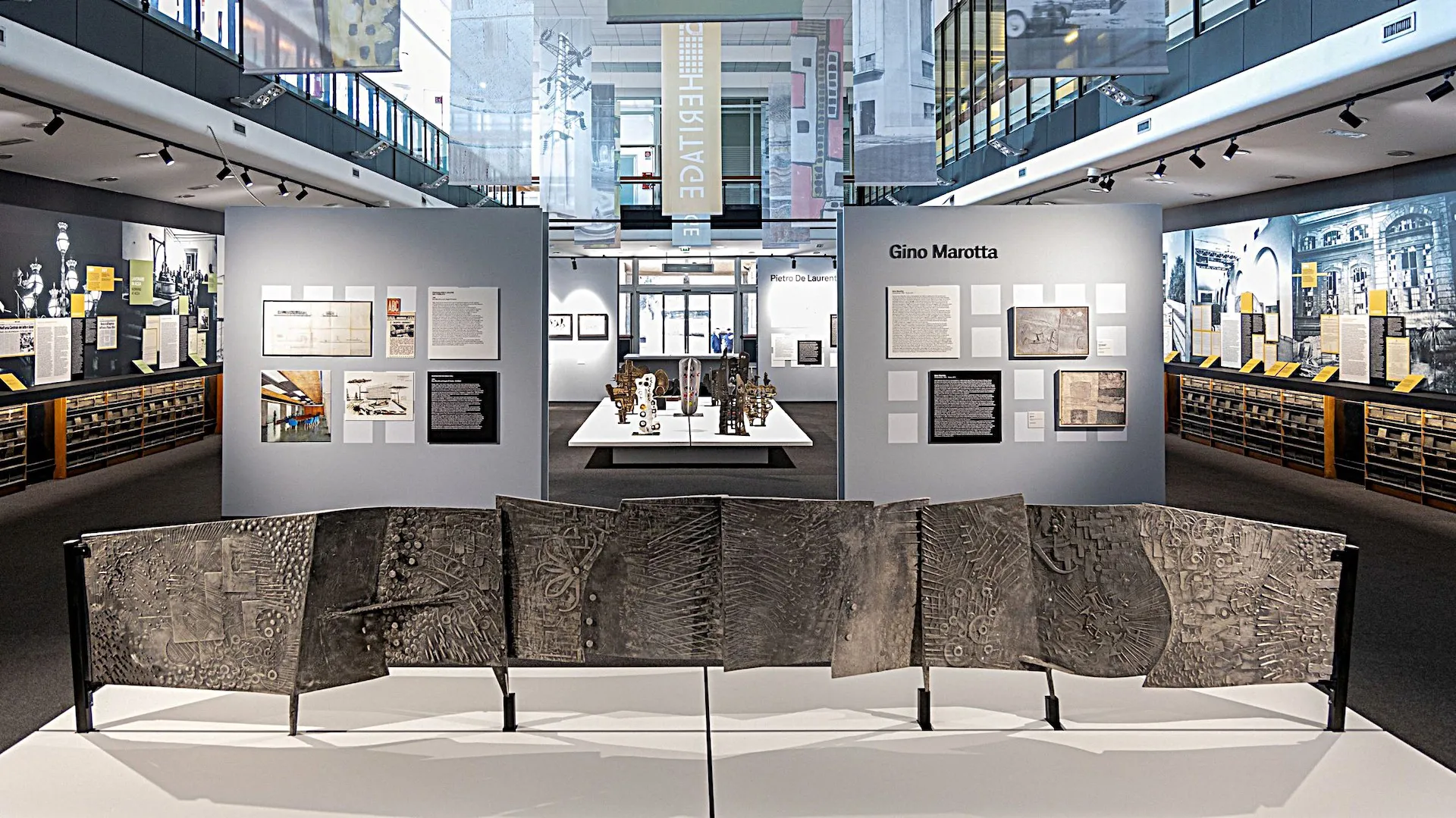 L’allestimento dello spazio centrale è interamente dedicato all’architetto e scultore Pietro de Laurentiis, che partecipò all’inizio degli anni Sessanta al concorso per la realizzazione dei due monumenti che si trovano all’esterno del palazzo.