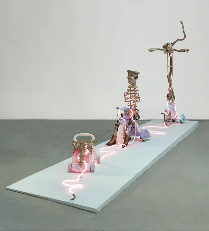 Il mezzobusto assemblato di un agente/soldato, assieme alla tetra restituzione di un teschio trafitto da luci al neon e legato a doppio filo alla presenza gommosa di piedini inchiodati a una croce, presenzia al cospetto delle calamità offerte da un itinerario mondo tanto infernale, quanto paradossale. Il serpente di bronzo così richiamato evoca il massimo emblema di onde tradizionalmente dinamiche come il moto di un rettile, oggi restituite nello sconforto della più stagnante e deleteria attesa.