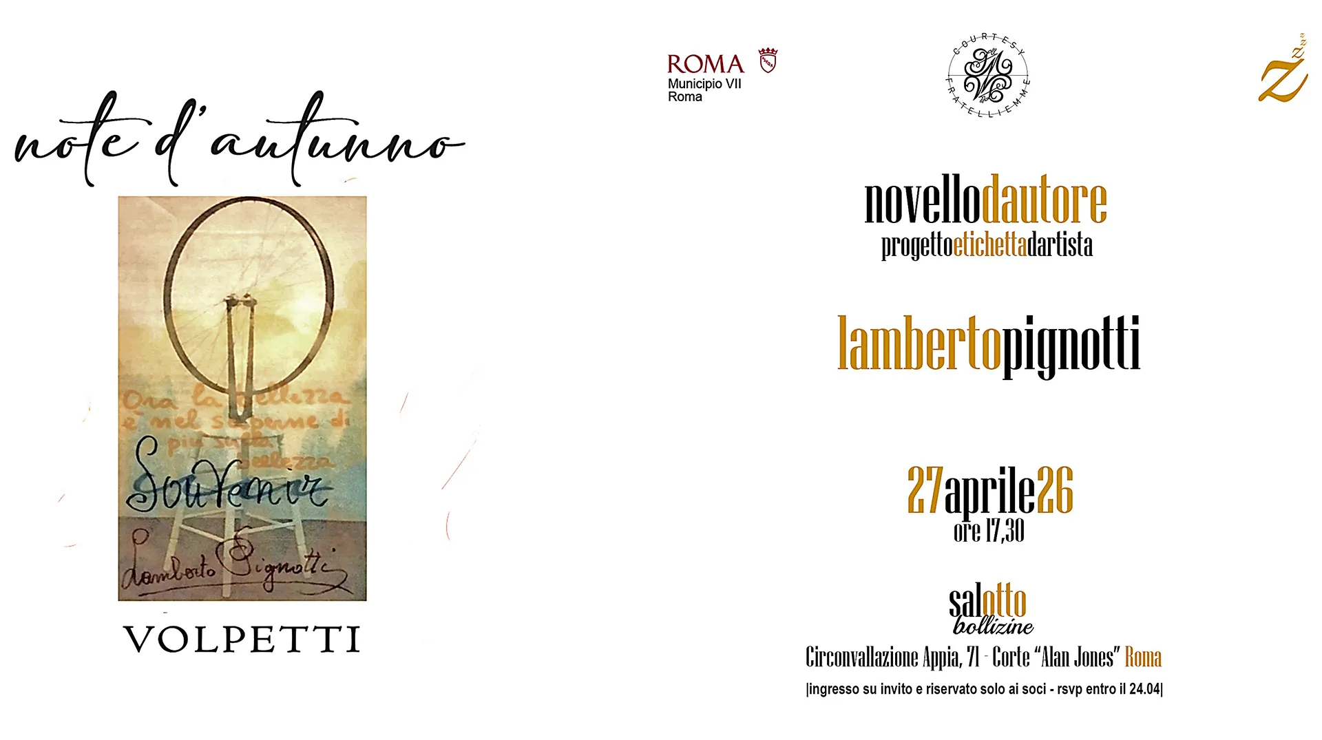 1. in occasione della citata serata del 27 aprile 2026 dedicata a Lambero Pignotti, è stata anche presentata un’etichetta vinicola d’autore appositamente realizzata dall’artista per le bottiglie del premiato (nel 2024) novello prodotto dalle cantine Volpetti di Ariccia, Roma.